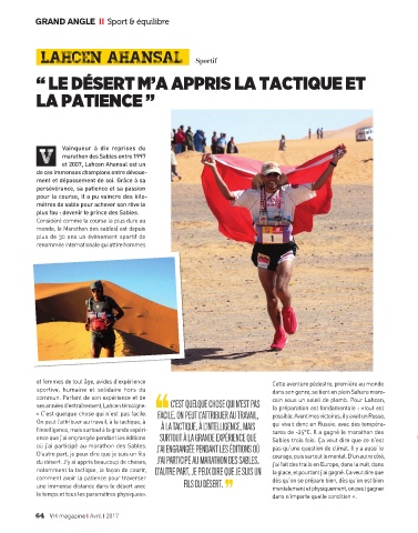 du désert. J’y ai appris beaucoup de choses, J’AI PARTICIPÉ AU MARATHON DES SABLES. j’ai fait des trails en Europe, dans la nuit, dans